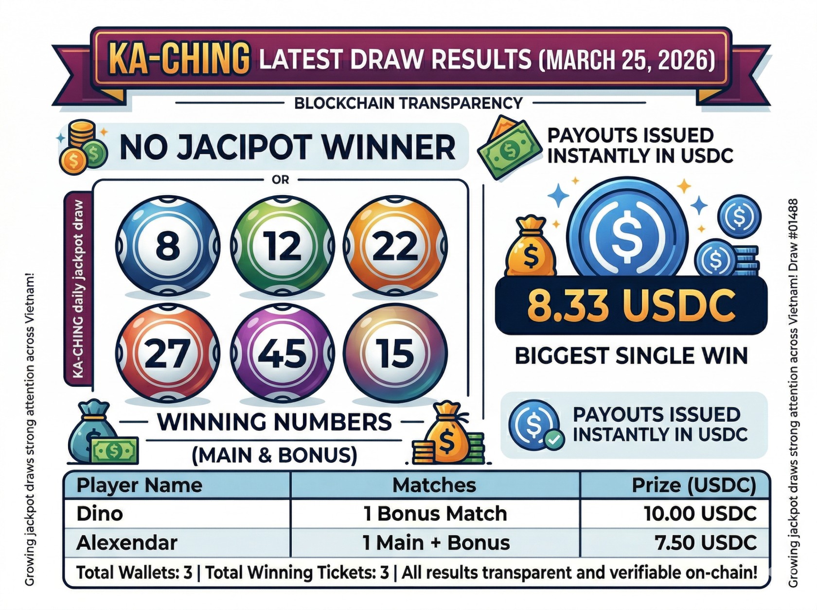Kết quả mới nhất từ Kaching đã được công bố, mang đến thêm nhiều người trúng thưởng trong kỳ quay hàng ngày. Với mô hình xổ số hiện đại dựa trên blockchain, Kaching đang thu hút sự quan tâm lớn từ cộng đồng người chơi yêu thích tiền điện tử.