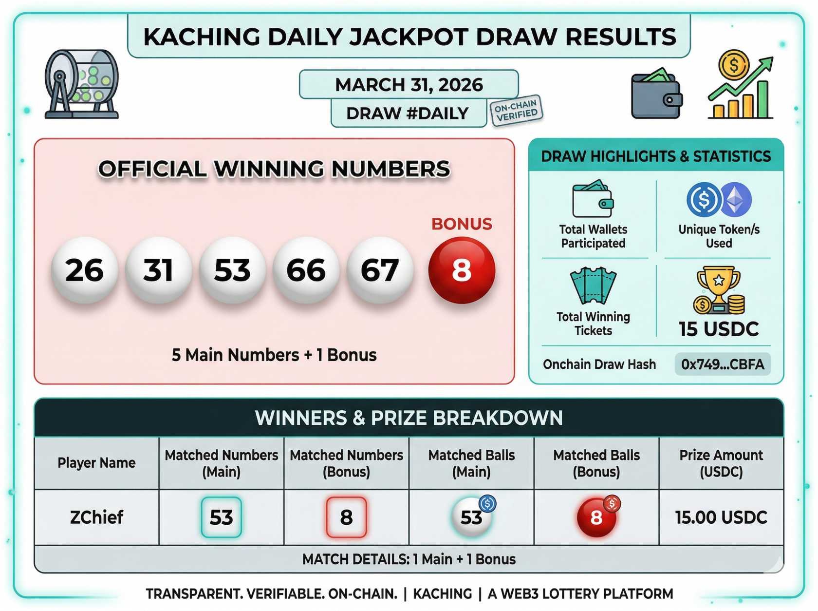 Kết quả Kaching ngày 31/03/2026 đã được công bố, mang đến thêm một kỳ quay đáng chú ý trong hệ sinh thái xổ số Web3. Với cơ chế minh bạch trên blockchain và hình thức trả thưởng bằng USDC, Kaching đang dần thu hút sự quan tâm của cộng đồng người dùng tiền số.