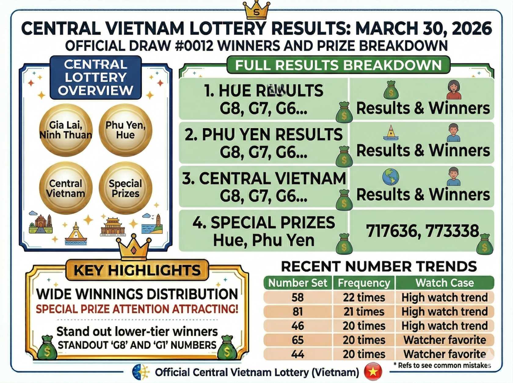 Kỳ quay Xổ số miền Trung ngày 30 tháng 3 năm 2026 đã chính thức công bố với đầy đủ kết quả từ hai tỉnh Huế và Phú Yên. Nhiều người chơi trên toàn khu vực miền Trung đã dò vé ngay sau giờ quay, khi các hạng giải từ G8 đến giải đặc biệt được cập nhật.