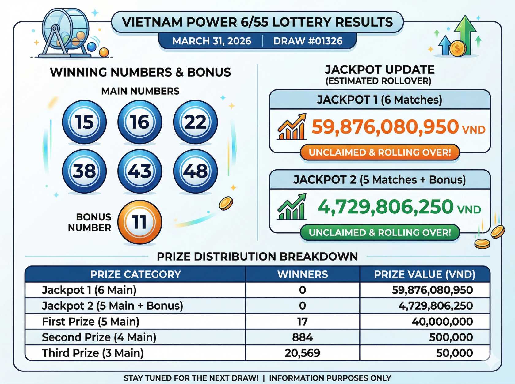 Dưới đây là thông tin chi tiết về kết quả, số trúng thưởng và bảng phân bổ giải thưởng để bạn dễ dàng kiểm tra.